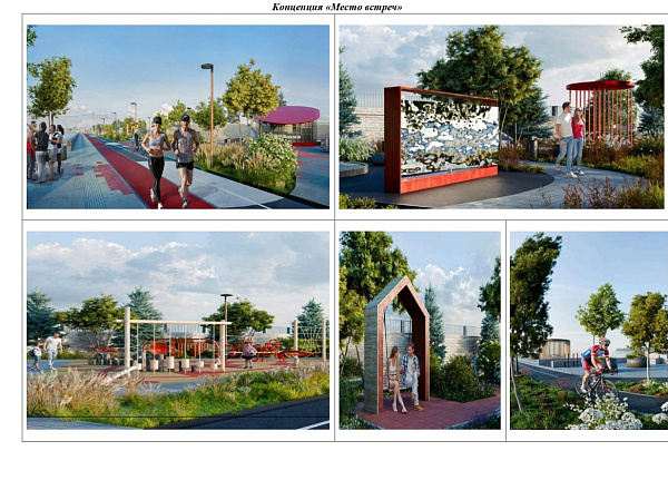 · Концепция «Место встреч» — ориентирована на создание комфортного пространства для отдыха и общения горожан. Она включает в себя беговую дорожку, детскую площадку, зону для отдыха и прогулок.
