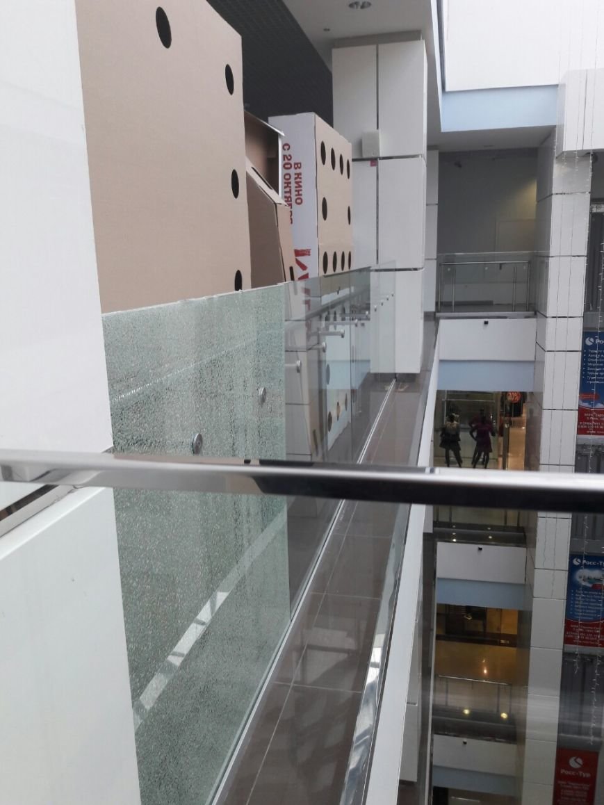 К нам в редакцию обратился житель Нижневартовска Алексей. Он обеспокоен бесопасностью в многофункциональном комплексе «Европа-Сити». На 4 этаже напротив билетных касс треснуло стекло в ограждении, а это значит, что оно представляет угрозу безопасности посетителей ТЦ.